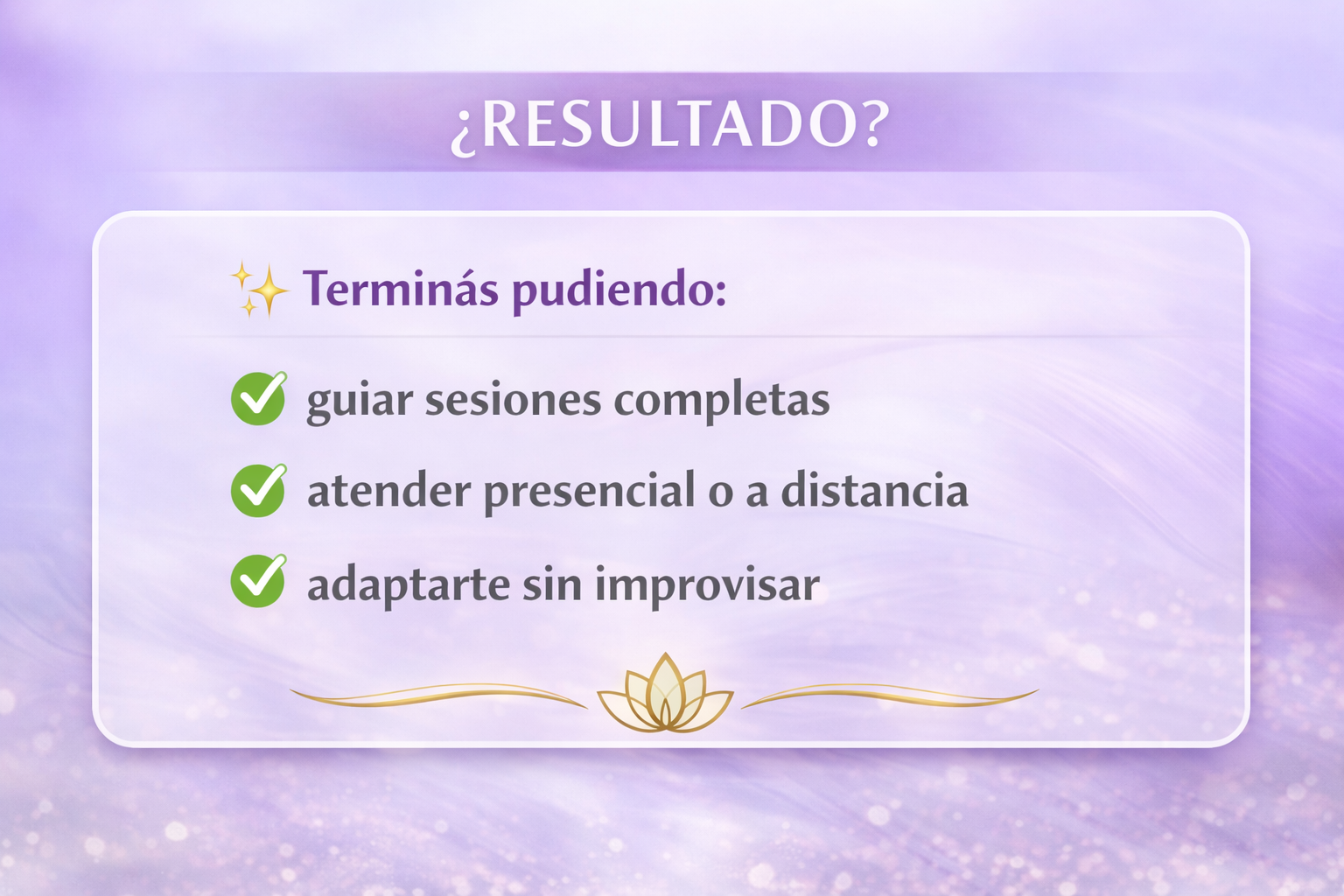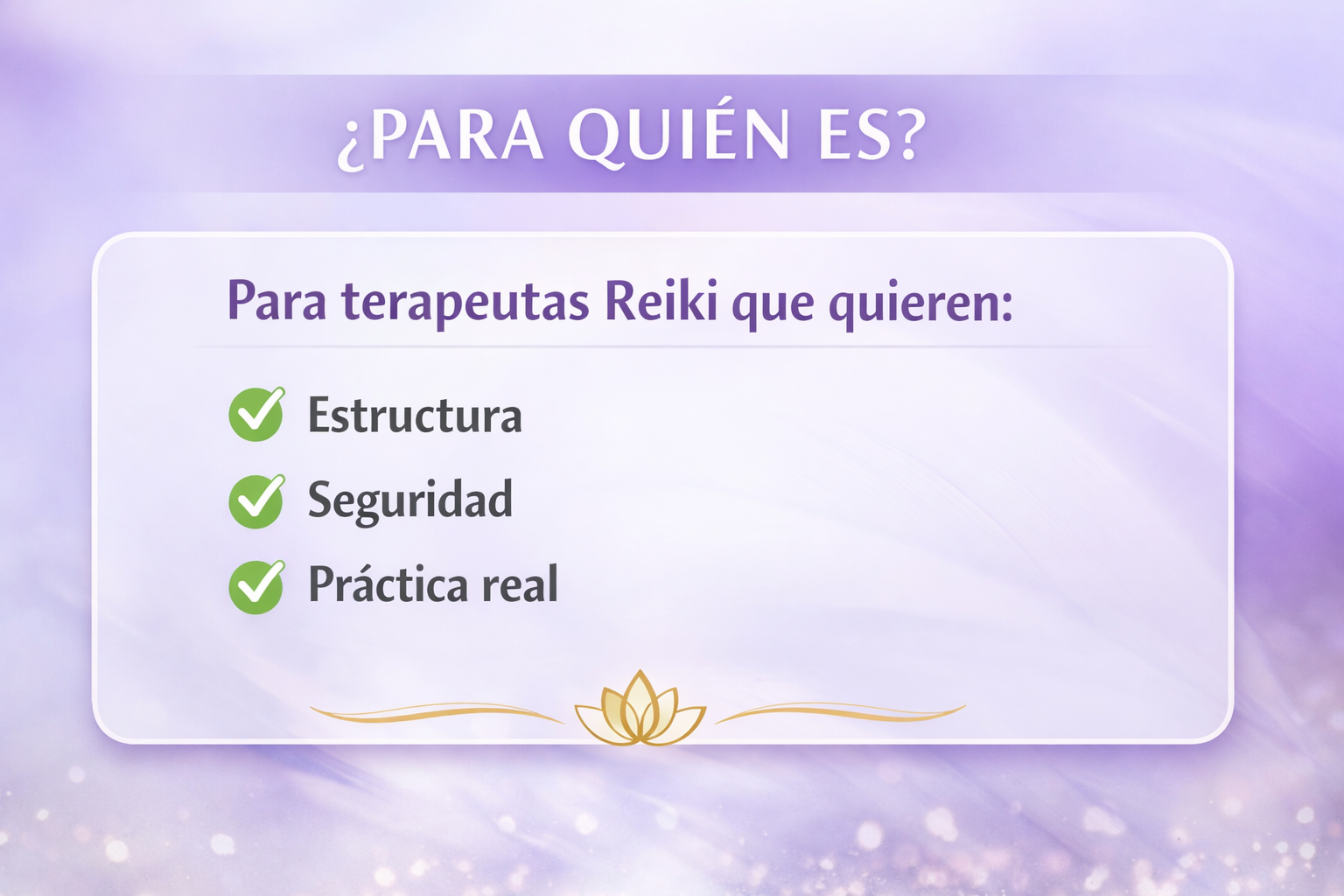Al finalizar este curso vas a poder: ✅ Armar una sesión completa de Reiki con estructura clara (inicio – desarrollo – cierre) ✅ Dejar de improvisar y aplicar un método práctico repetible en cualquier caso ✅ Saber exactamente qué hacer paso a paso desde que el paciente llega hasta que se va ✅ Aplicar Reiki con confianza en casos reales, incluso si hoy te sentís insegura/o ✅ Usar protocolos simples para estrés, ansiedad, insomnio, dolor físico y baja energía ✅ Aprender cómo sostener la sesión de forma profesional, sin perder tu intuición ✅ Dar sesiones presenciales y a distancia con la misma claridad y orden ✅ Mejorar tu comunicación terapéutica, sabiendo qué decir y cómo guiar al paciente ✅ Cerrar sesiones correctamente, dejando una sensación de contención y seguridad ✅ Registrar y organizar tus sesiones con plantillas prácticas y fáciles de usar ✅ Sentirte más segura/o como terapeuta y elevar tu nivel profesional